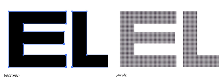 Vectoren worden meestal gebruikt voor logo’s of illustraties en worden opgeslagen als een Ai of EPS bestand. Een PDF kan ook vectoren bevatten, maar let op: niet ieder logo in een PDF bestand bestaat ook daadwerkelijk uit vectoren.