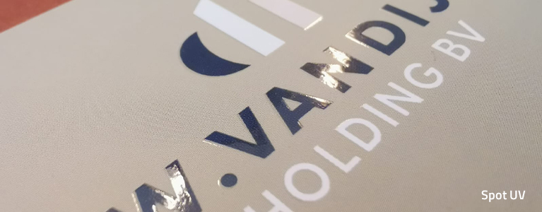 Spot-UV lak is een glanzende laklaag die ook wordt aangebracht op bepaalde gebieden. Door deze techniek te gebruiken kunnen sommige onderdelen extra worden belicht!